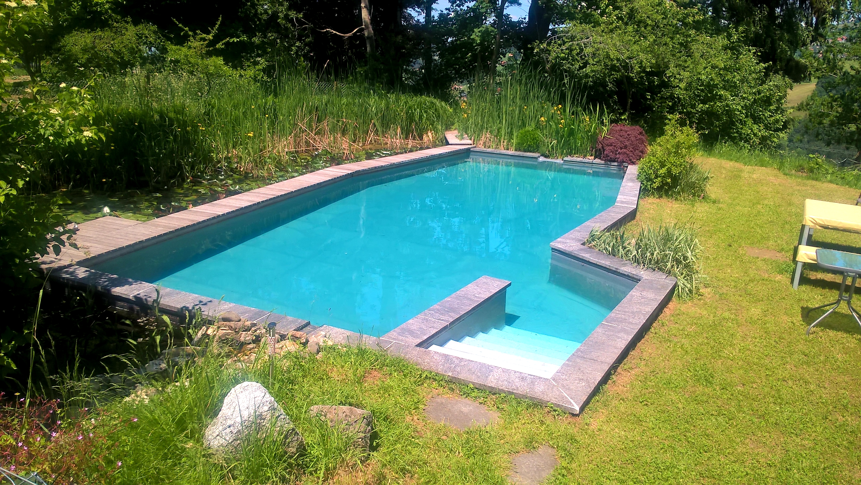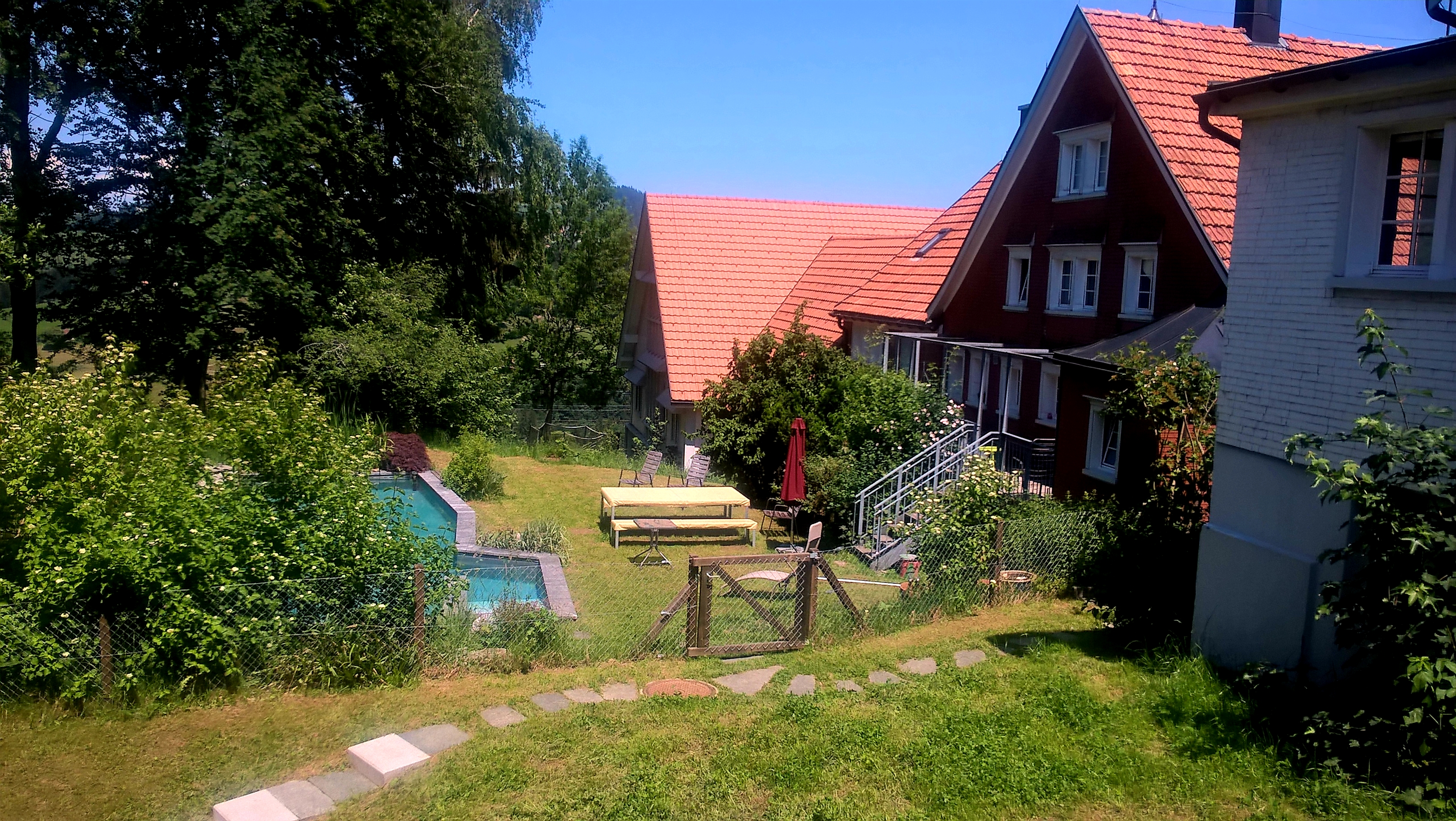 Das Haus am Teich, hält was es verspricht. Im Garten befindet sich ein Schwimmteich, der gerade sommerfit gemacht wird, damit die Badesaison losgehen kann.