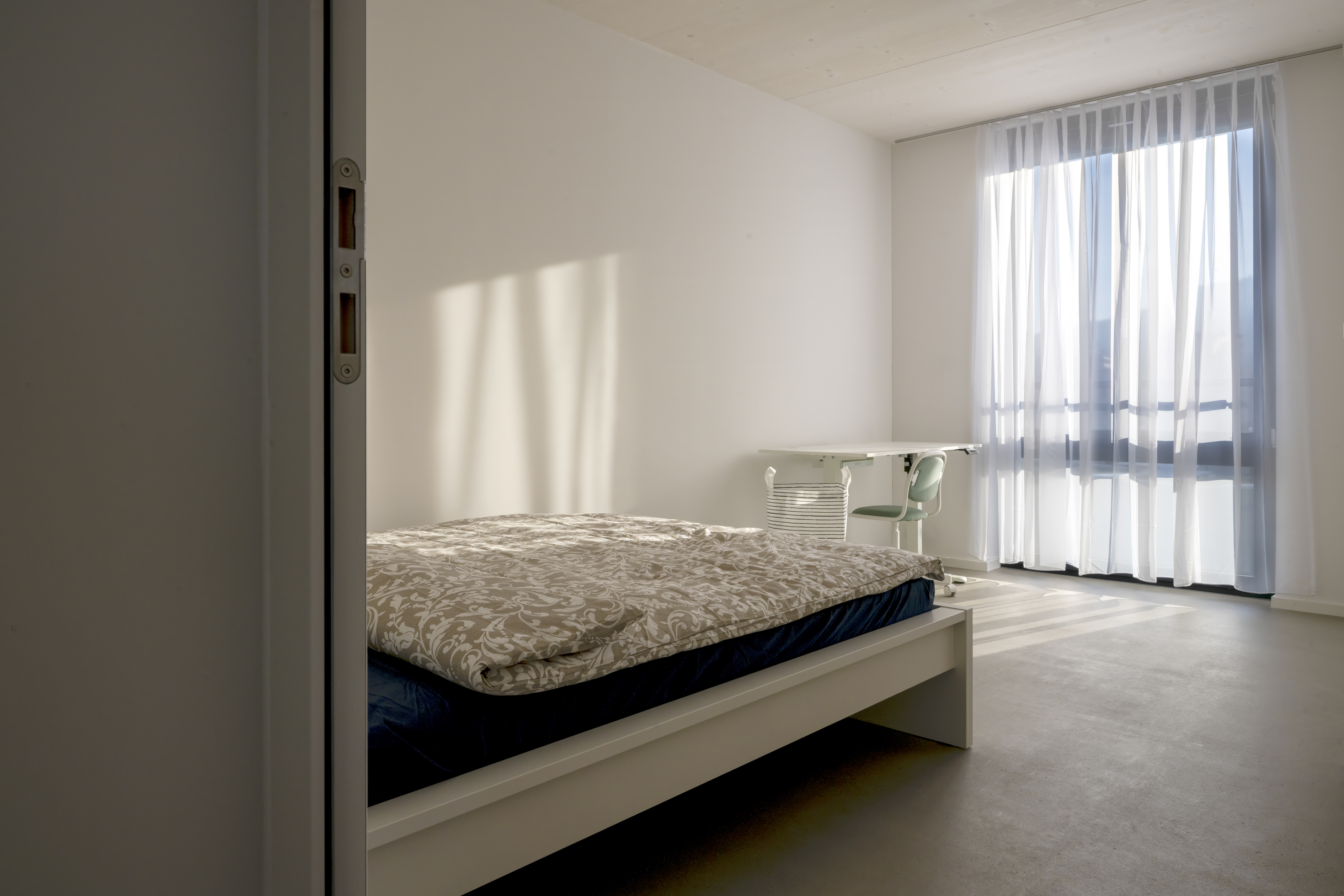 Die Zimmer sind über zwei Stockwerke verteilt und haben Zugang zu einer Terasse, und Balkon. Jedes Einzelzimmer ist beim Einzug einfach möbliert. Küche Dusche, Bad und Wohnraum werden gemeinsam genutzt.